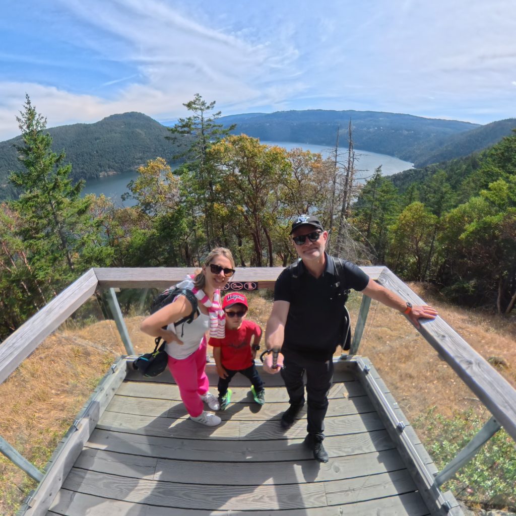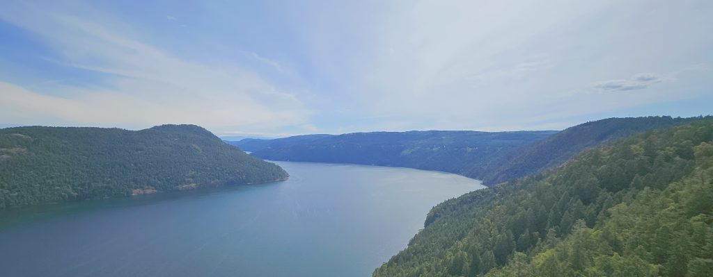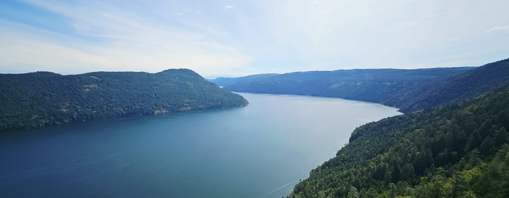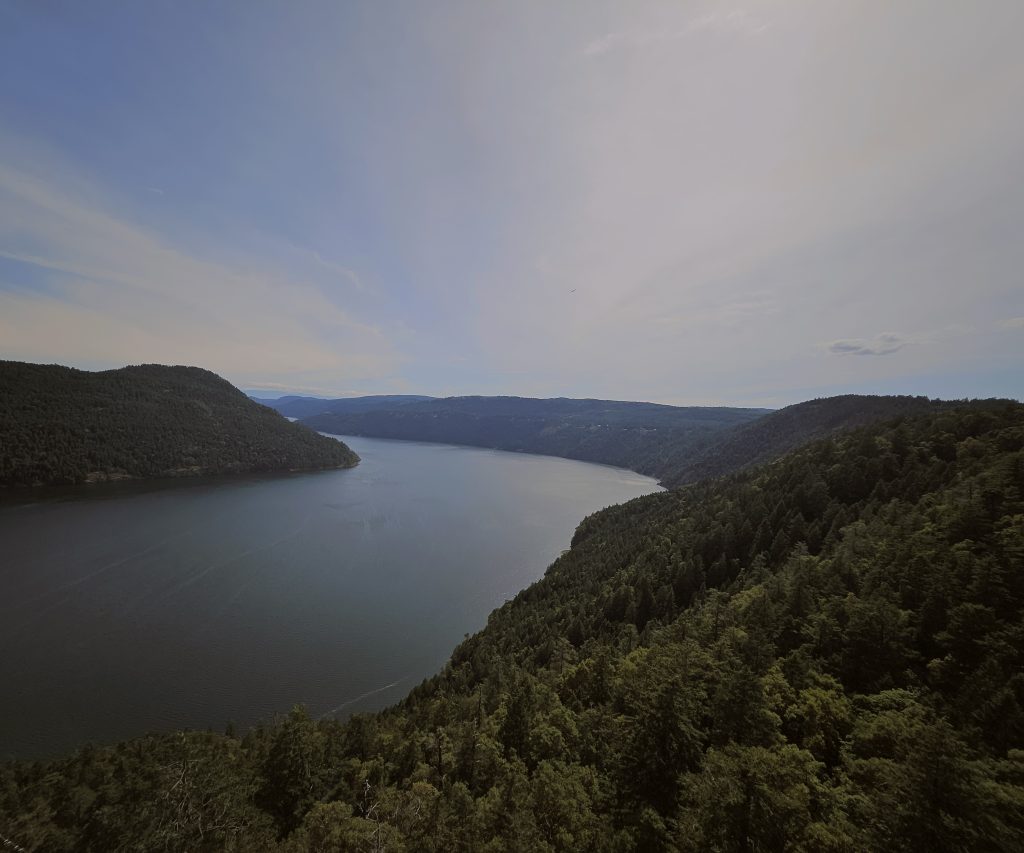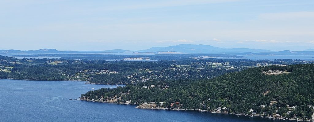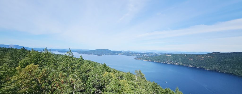 De là-haut, la vue est imprenable sur les Gulf Islands, le détroit de Haro, les montagnes lointaines des États-Unis, et même — lorsque les nuages se dispersent — sur les cimes enneigées de la chaîne côtière.