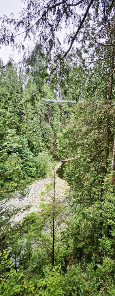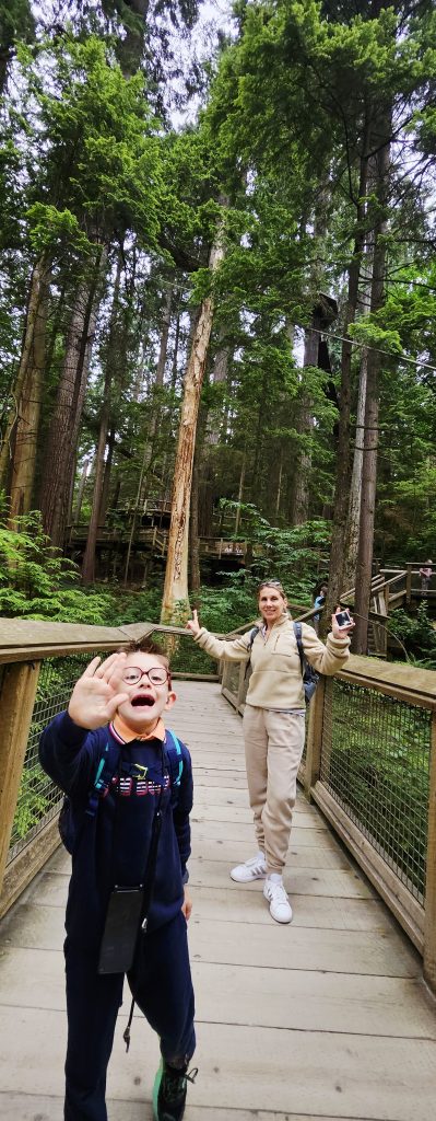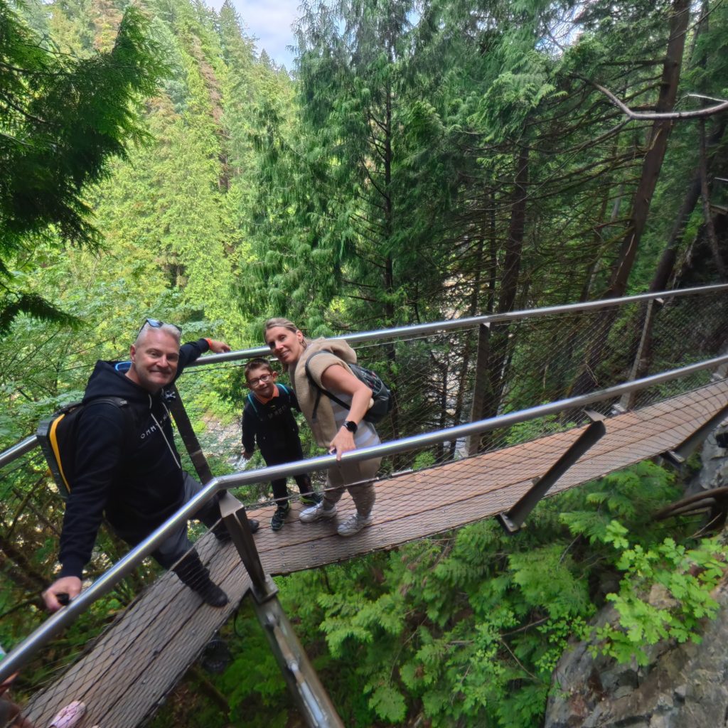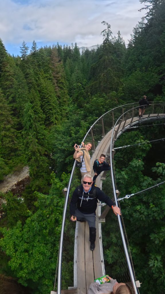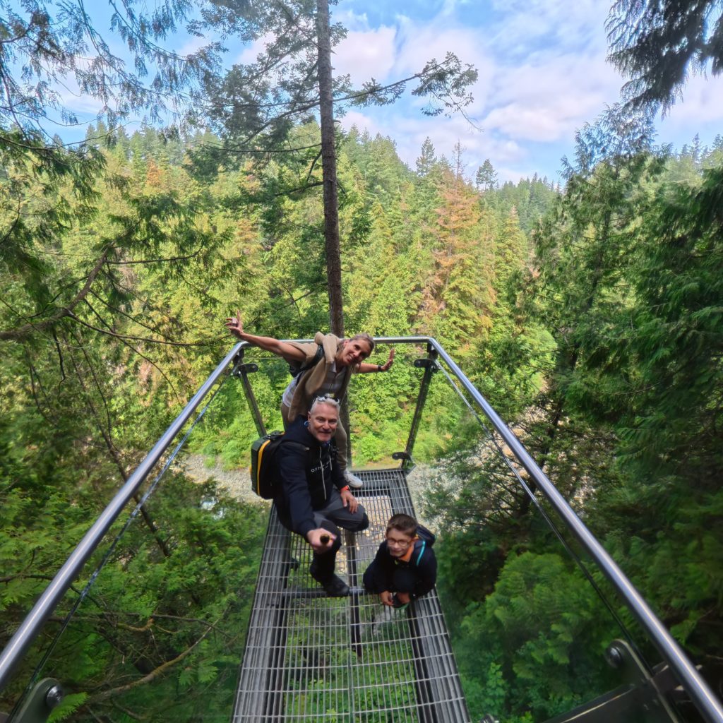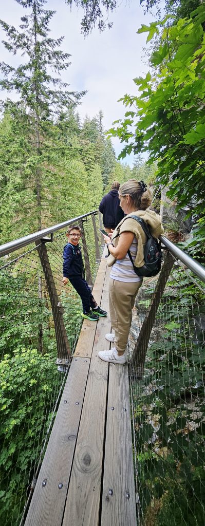 À peine sortis de la ville, on se retrouve au cœur d’une forêt digne d’un film d’aventure. Le pont, long de 137 mètres et suspendu à 70 mètres au-dessus de la rivière Capilano, oscille sous les pas et fait battre les cœurs plus vite.