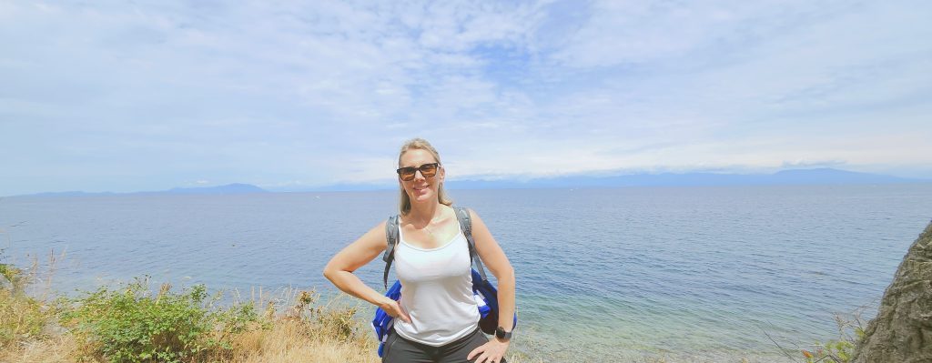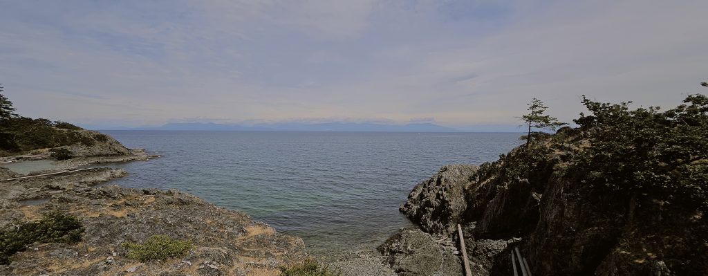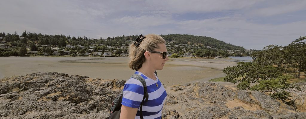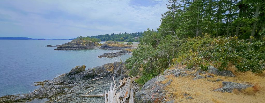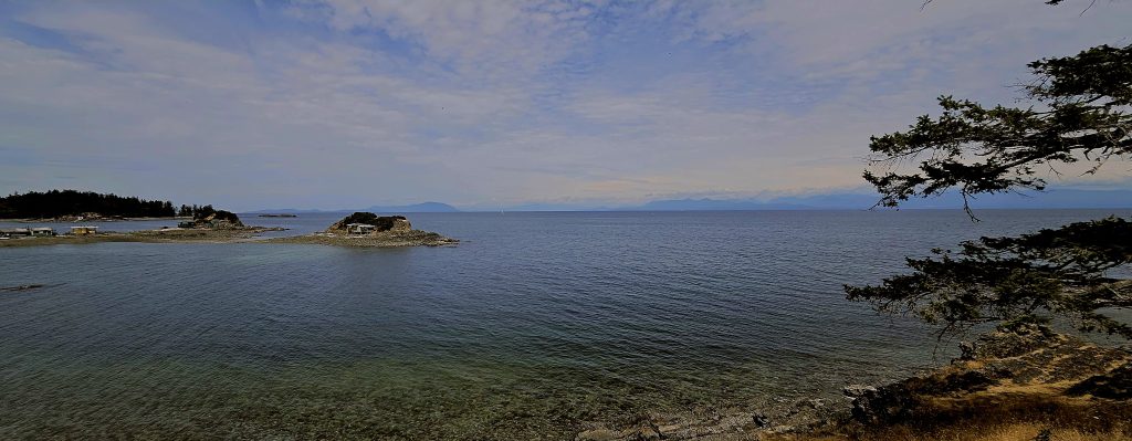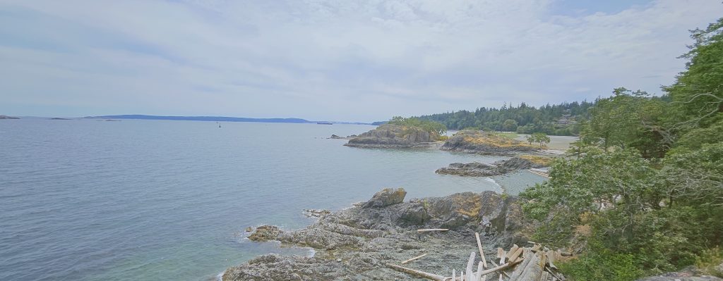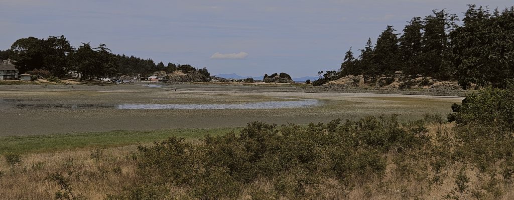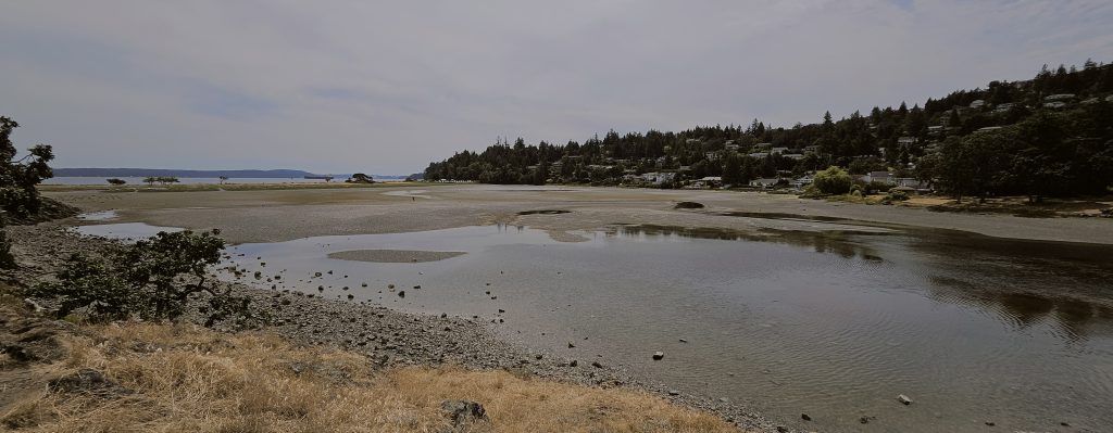 Aujourd’hui, nous avons quitté Victoria en direction de Nanaimo, laissant derrière nous le faste victorien pour nous enfoncer un peu plus dans le mystère naturel de l’île. Premier arrêt : le Pipers Lagoon Park. Le ciel était légèrement voilé, mais la lumière douce mettait en valeur les contrastes d’un paysage unique : d’un côté, la baie asséchée par la marée basse, de l’autre, l’immensité des montagnes qui se fondaient dans les nuances calmes de la mer.