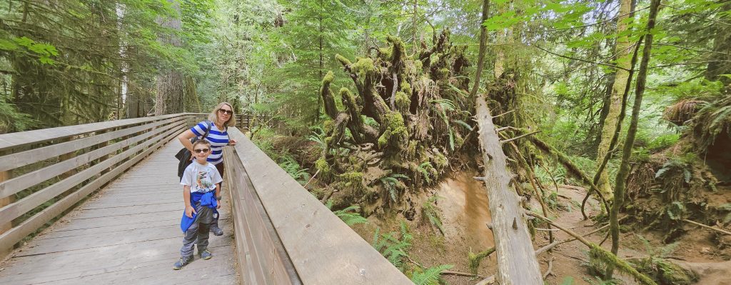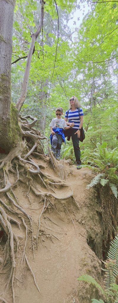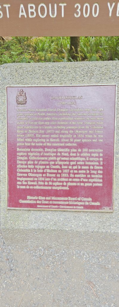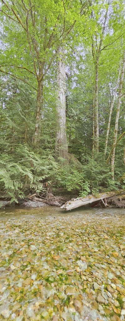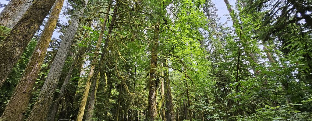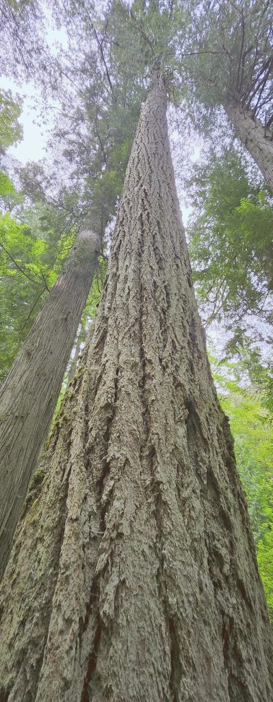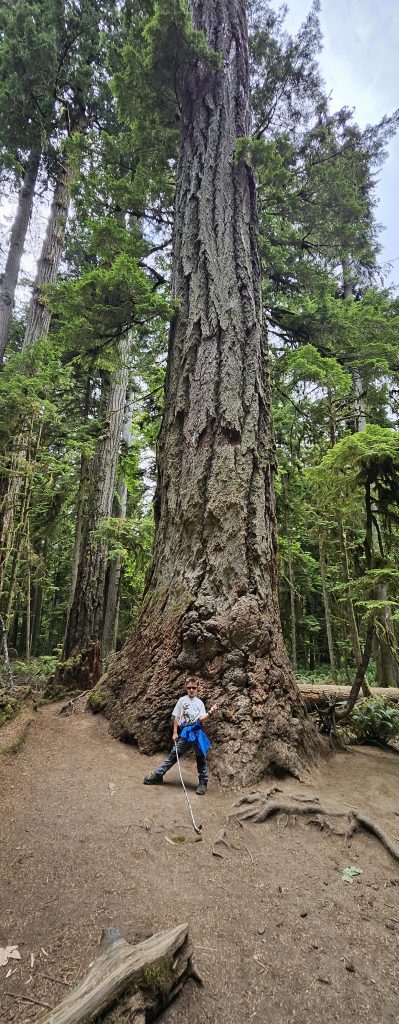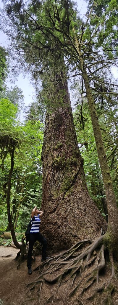 Nous avons ensuite repris la route vers l’intérieur de l’île, direction Cathedral Grove, dans le MacMillan Provincial Park. Ce lieu porte bien son nom : entrer dans cette forêt, c’est comme pénétrer dans une cathédrale végétale. Le silence y est feutré, presque religieux, et les arbres, vieux parfois de plus de 800 ans, s’élèvent comme des piliers célestes. Ces douglas taxifoliés, certains parmi les plus anciens du Canada, peuvent mesurer jusqu’à 75 mètres de haut. À leurs pieds, une végétation luxuriante de mousse émeraude, de fougères géantes, et de troncs tombés recouverts d’un velours végétal.