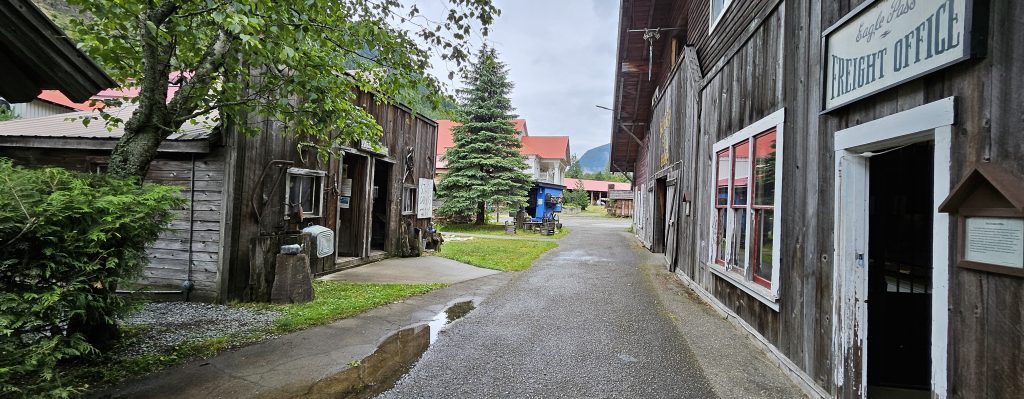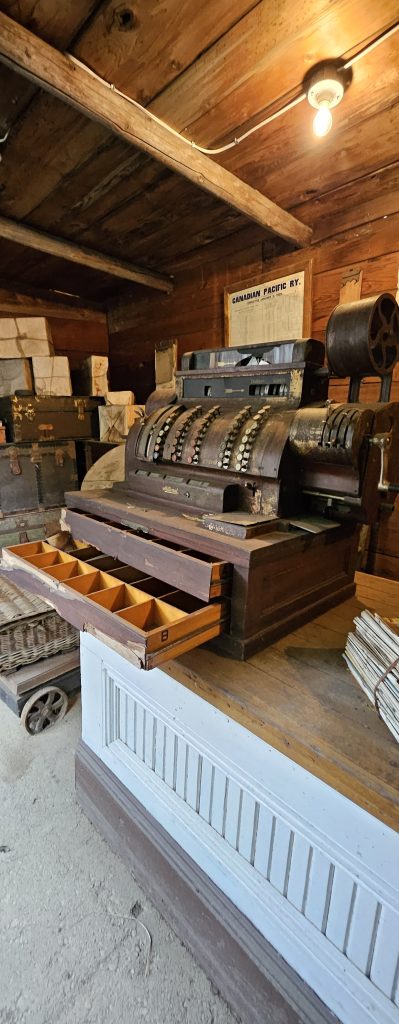 Le site est niché au creux d’un couloir naturel entre montagnes et lac. Autrefois, l’endroit abritait une petite communauté établie autour du développement du chemin de fer du Canadien Pacifique, puis tomba lentement dans l’oubli. Ce n’est que dans les années 1960 que Gordon et Ethel Bell, passionnés d’histoire et de patrimoine, décidèrent de redonner vie à cette époque perdue. Ils achetèrent des bâtiments entiers, les démontèrent planche par planche à travers la province, et les remontèrent ici, au bord du lac Three Valley.Aujourd’hui, plus de 30 bâtiments historiques recréent la vie quotidienne des pionniers du XIXe siècle : école, poste de police, église, saloon, imprimerie, boutique générale, hôtel Bellevue, et même une rue commerçante complète, où tout semble encore habité.Nous avons pris le temps d’explorer chaque recoin : chaque devanture, chaque enseigne, chaque grincement de bois semblait porter une mémoire. L’église St. Stephen, venue du village de Donald en 1886, conserve encore ses bancs en bois patinés. Le magasin général C.B. Hume, déplacé depuis Nelson, montre encore ses étals d’époque, remplis de bouteilles médicinales, de conserves en fer-blanc et de rouleaux de tissu.