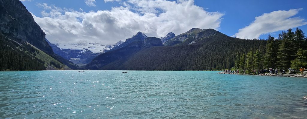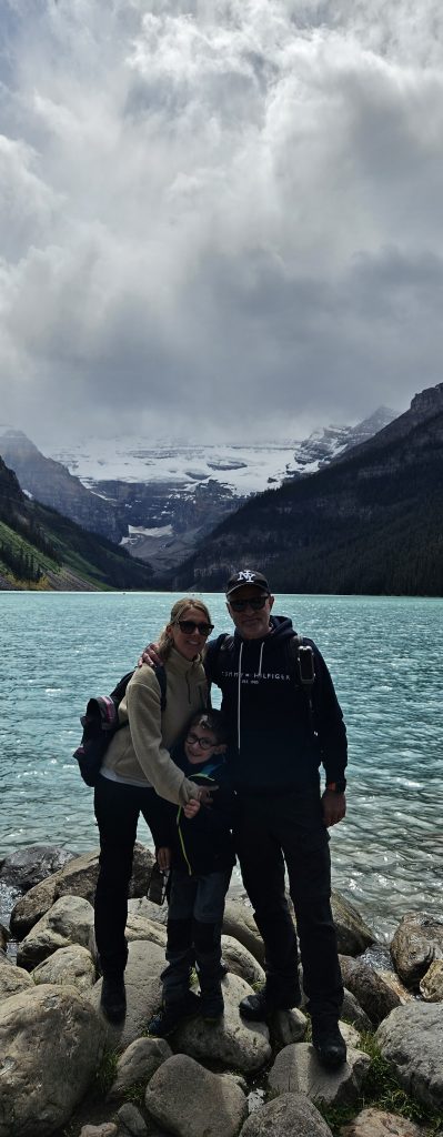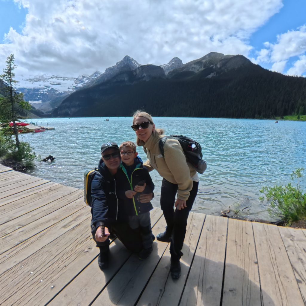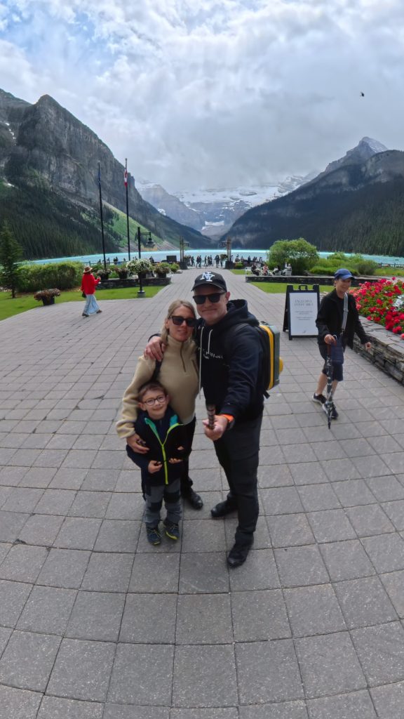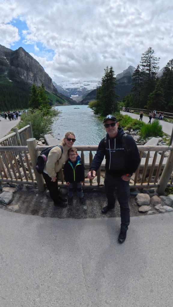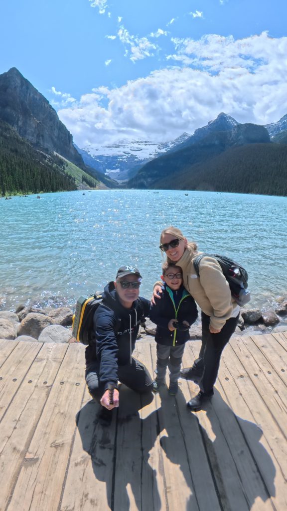 Poursuivant notre périple, nous avons atteint Lake Louise, véritable carte postale du Canada alpin. Autrefois connu sous le nom de Ho-run-num-nay (le « lac des petits poissons ») par les Stoney Nakoda, le lac fut renommé en 1884 en l’honneur de la princesse Louise Caroline Alberta, quatrième fille de la reine Victoria. Il est niché au cœur du parc national de Banff, classé au patrimoine mondial de l’UNESCO depuis 1984.Ce lac glaciaire, alimenté par la fonte du glacier Victoria, doit sa couleur turquoise spectaculaire à la farine glaciaire — une poussière de roche en suspension qui réfléchit la lumière. L’essor touristique du lac débuta avec la construction du somptueux Château Lake Louise en 1890 par la compagnie ferroviaire du Canadien Pacifique, qui souhaitait en faire une destination de luxe pour les voyageurs européens.Malgré l’affluence, la magie opérait. Nous avons longé les rives en famille, entourés de pics enneigés et de forêts profondes, avec Benjamin qui essayait de repérer les canoës rouges devenus emblématiques du lieu.