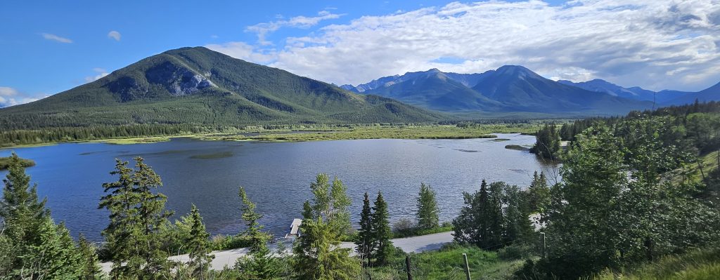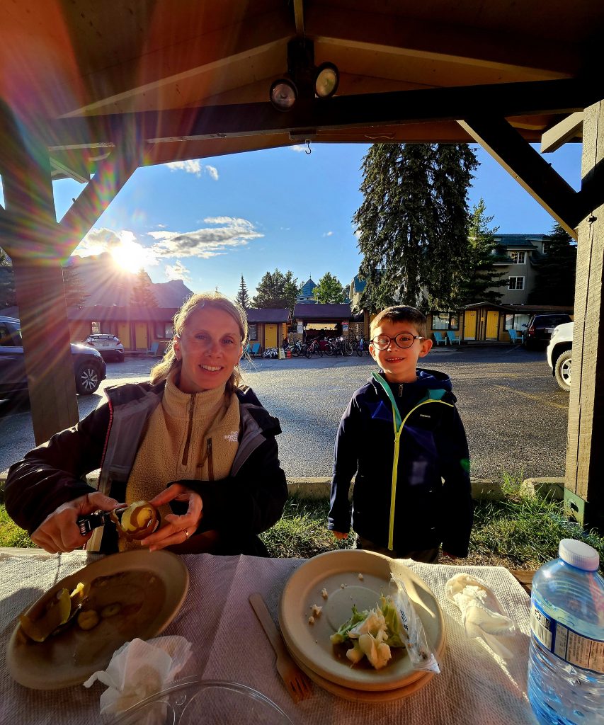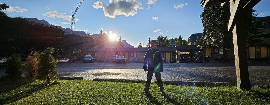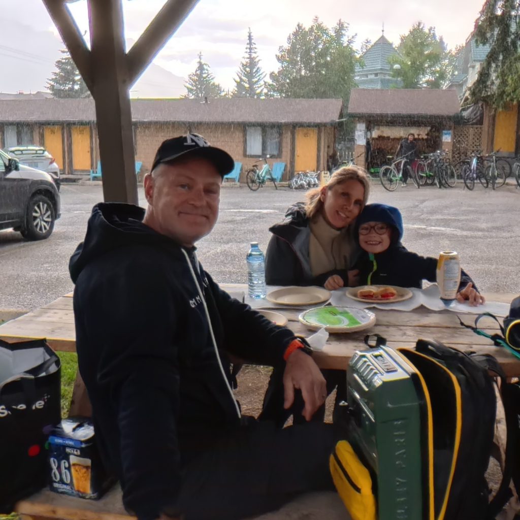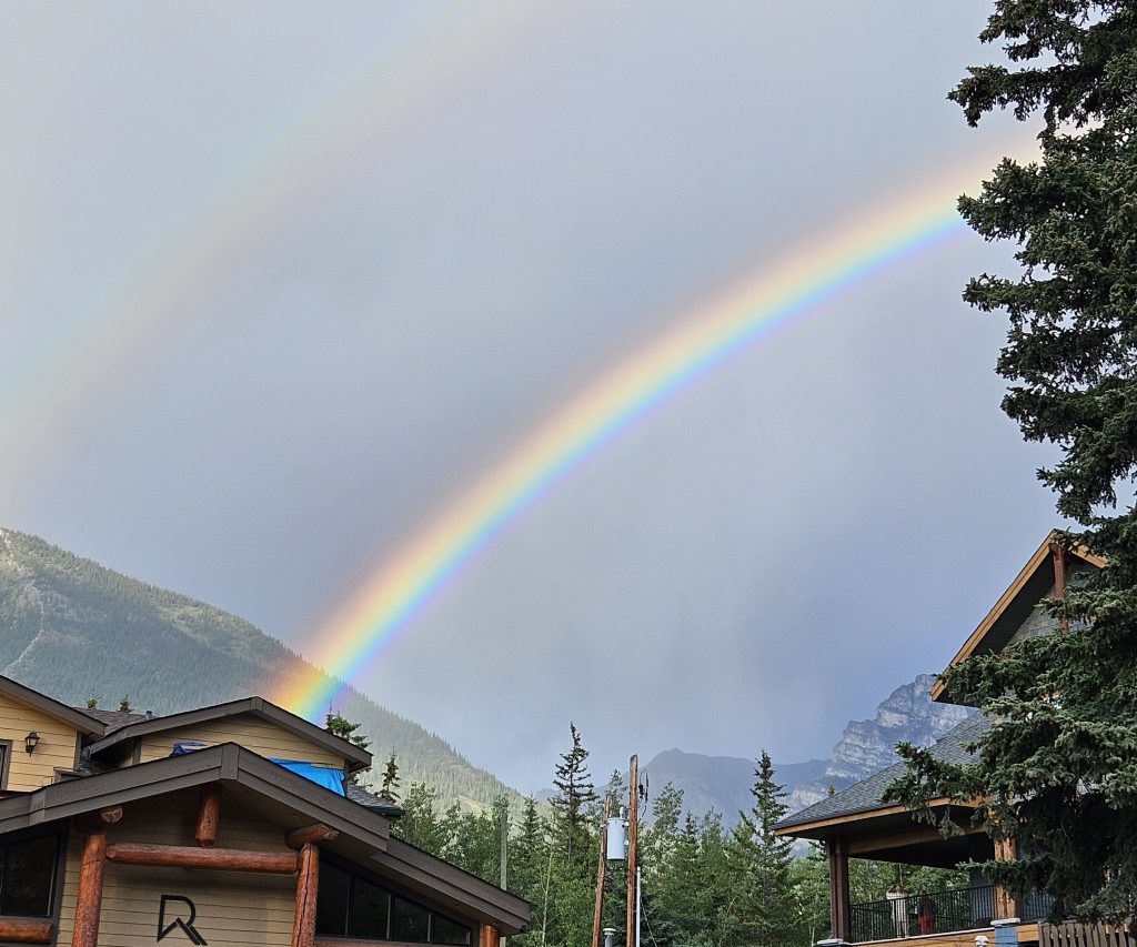 En fin de journée, nous avons atteint Canmore, charmante ville aux portes du parc de Banff. Contrairement à Banff, plus touristique, Canmore est un ancien village minier fondé en 1883, à la suite de la découverte de charbon lors de l’expansion du chemin de fer. La ville a connu un véritable renouveau dans les années 1980 après avoir accueilli certaines épreuves des Jeux olympiques d’hiver de Calgary en 1988. Aujourd’hui, elle attire randonneurs, artistes, et familles en quête de quiétude montagnarde.Nous avons dîné sous une pergola en bois rustique, attenante à notre hébergement. Une grande table champêtre, quelques guirlandes discrètes, et autour de nous, le clapotis de la pluie résiduelle. Un arc-en-ciel est apparu juste au moment du dessert, embrassant les montagnes alentour dans une lumière douce et dorée.