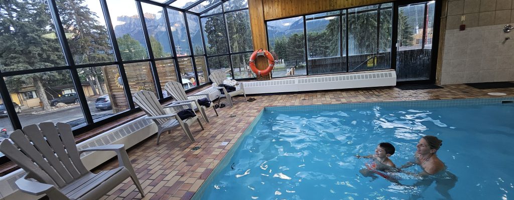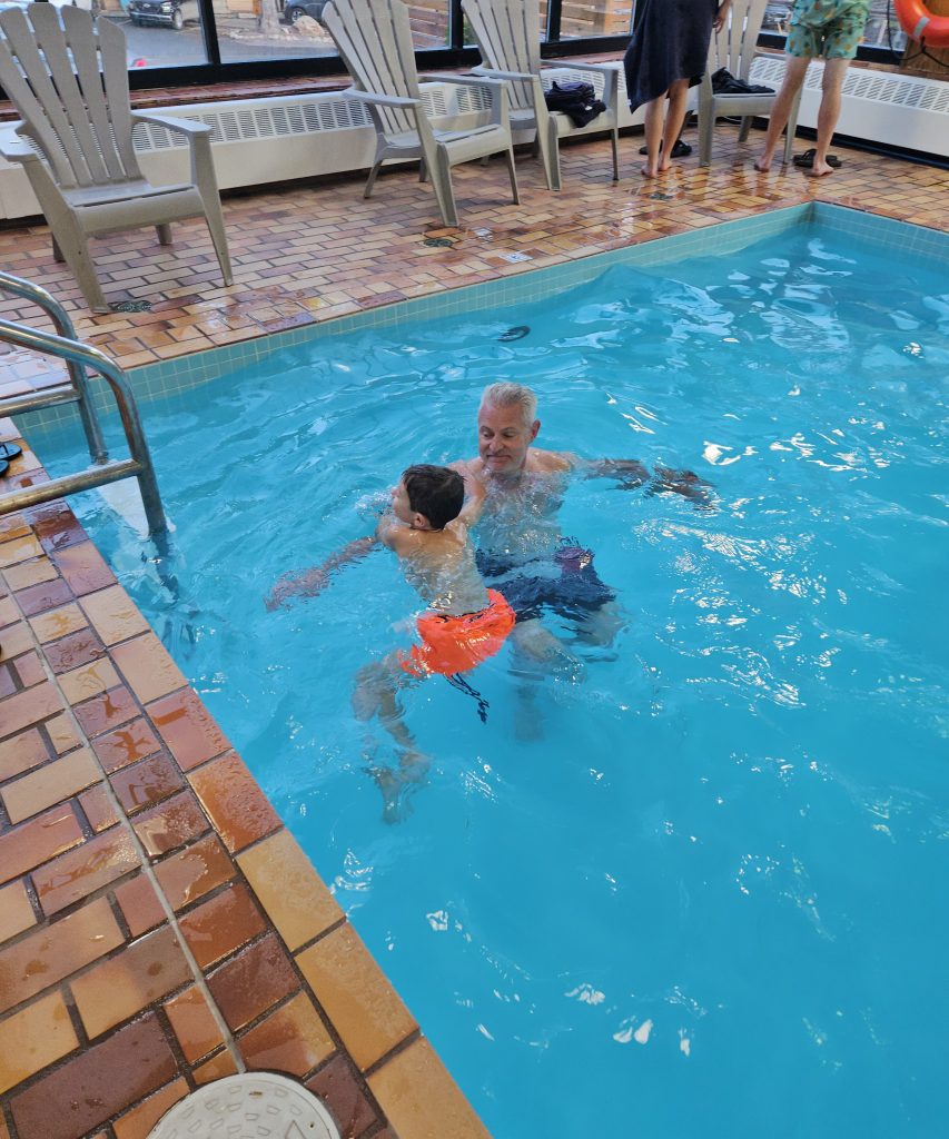 Nous avons terminé la soirée dans la piscine intérieure de l’hôtel, un moment simple et joyeux. Benjamin s’est amusé comme un fou, et nous avons savouré cet instant de calme après une journée riche en contrastes.