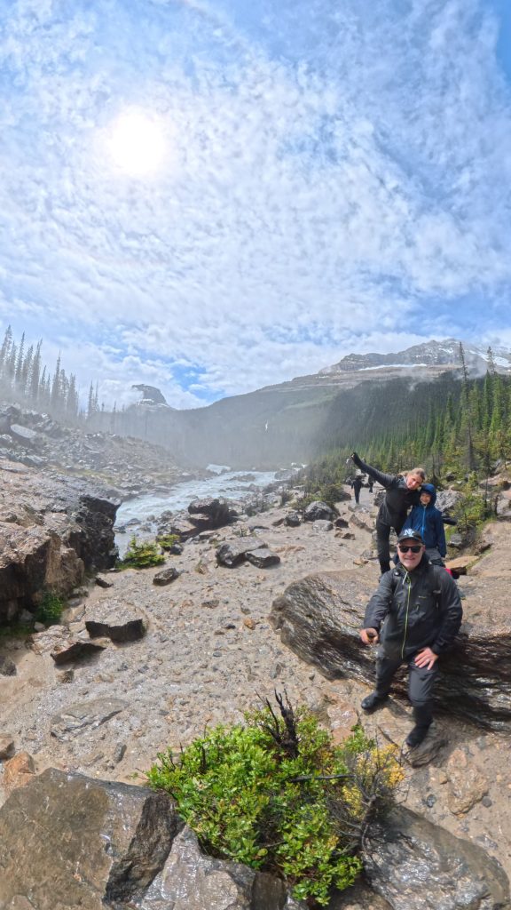 Nous avons d’abord fait halte aux chutes Takakkaw, dans le parc national Yoho. Ce nom, issu de la langue cri, signifie « magnifique » ou « étonnant », et c’est peu dire. Ces chutes, hautes de 373 mètres au total (les deuxièmes plus hautes du Canada), dévalent la falaise en une cataracte saisissante. Elles sont alimentées par le glacier Daly, vestige du champ de glace Waputik, ce qui explique leur débit impressionnant, particulièrement en été lors de la fonte.Ce site fut découvert par les premiers explorateurs canadiens vers la fin du XIXe siècle, alors que la ligne ferroviaire du Canadien Pacifique ouvrait la région aux visiteurs. Le sentier qui mène aux chutes traverse un petit pont suspendu, des forêts denses de conifères et une brume d’embruns qui semble irréelle. Ce jour-là, alors que la pluie tombait sans relâche sur la route, le ciel s’est soudain ouvert à notre arrivée, comme pour mieux révéler la grandeur du lieu.