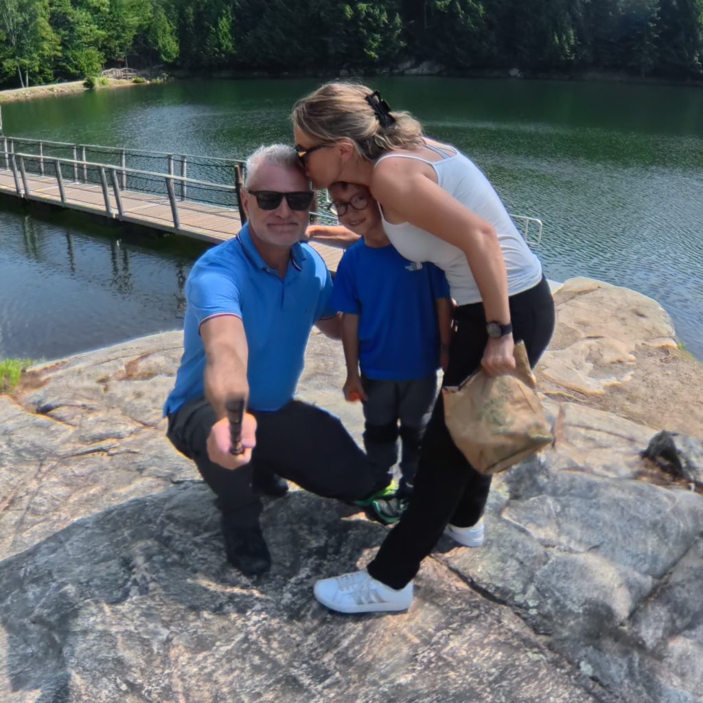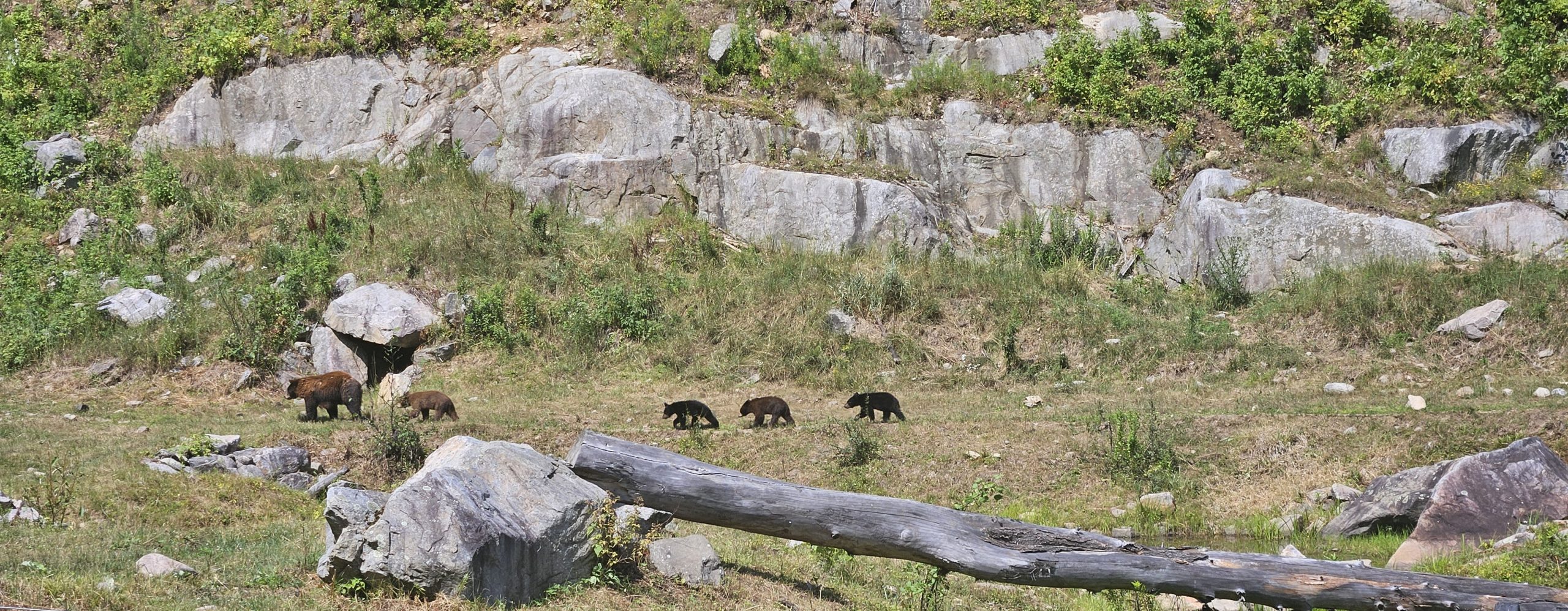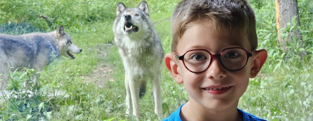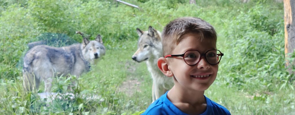 🧸 Plus loin, des ours noirs et bruns, perchés sur des rochers ou endormis à l’ombre, nous rappellent que la puissance et la douceur peuvent cohabiter. Les loups gris, plus discrets mais fascinants, veillent depuis leur territoire boisé. Quant à Benjamin, il n’en perd pas une miette, pointant chaque animal avec émerveillement.