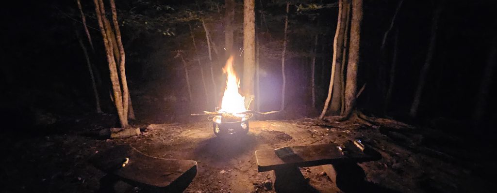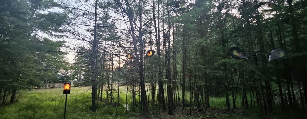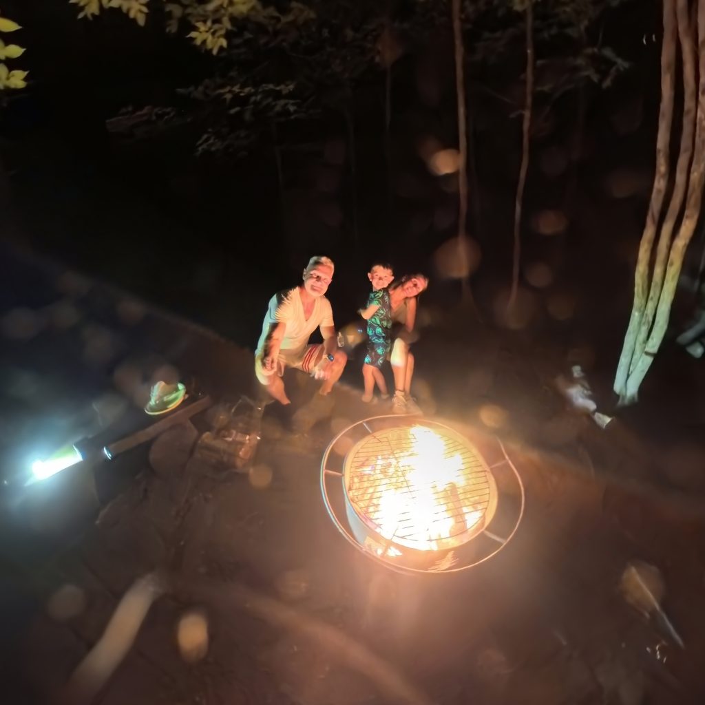 🦉 À la nuit tombée, le parc s’éteint pour les autres visiteurs, mais nous restons. On nous propose de prolonger l’expérience avec la visite nocturne son & lumière, mais l’appel du calme et du feu de bois est plus fort