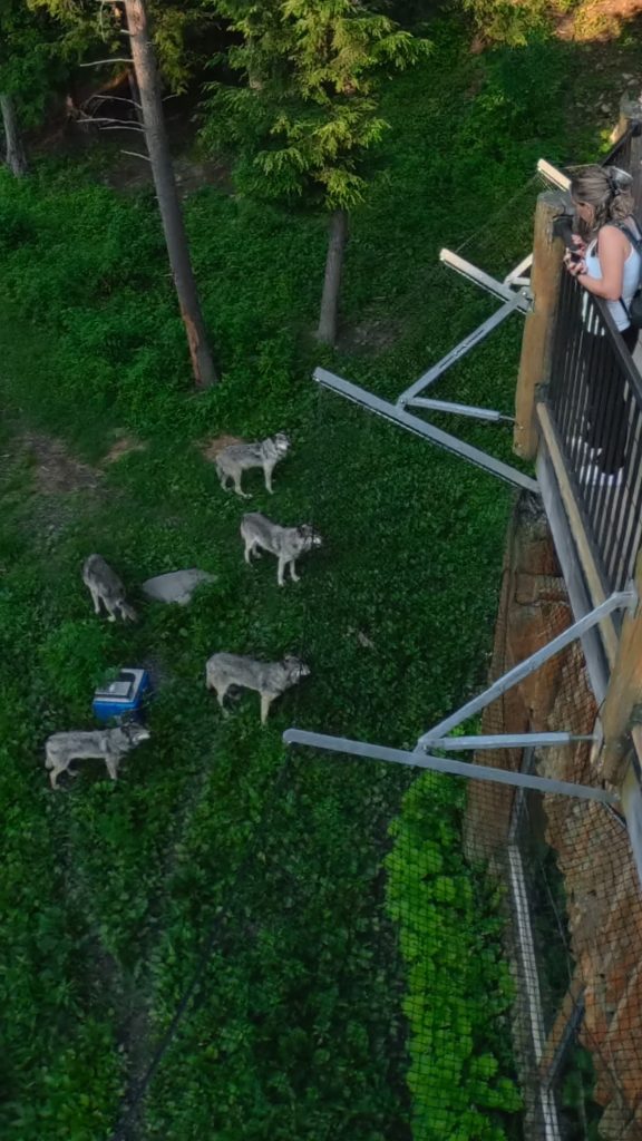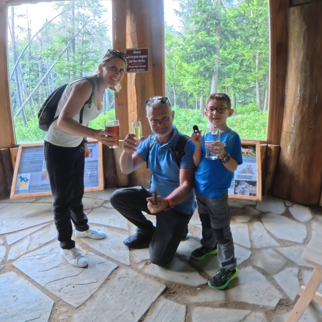 🌲 Après avoir posé nos sacs, nous avons enchaîné avec un moment d’exception : la soirée cocktail au cœur du parc. Nous n’étions qu’une dizaine de privilégiés, presque seuls au monde. Sous les lumières dorées du crépuscule, un guide naturaliste nous a invités à observer le nourrissage des loups.