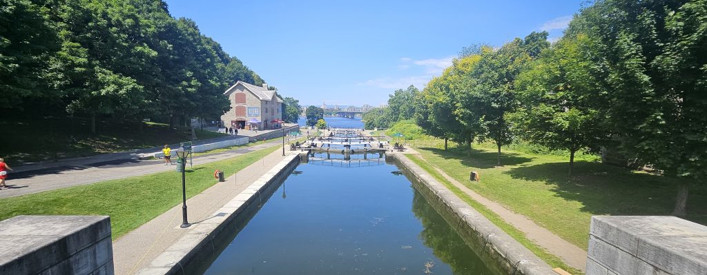 🌿 Nous avons ensuite traversé les jardins paysagers du Parlement, riches en fleurs et en points de vue sur la rivière des Outaouais, avant de longer les écluses du canal Rideau, classé au patrimoine mondial de l’UNESCO. Construit entre 1826 et 1832 pour des raisons militaires, ce canal permettait à l’origine de relier le fleuve Saint-Laurent aux Grands Lacs en évitant la menace américaine. Aujourd’hui, c’est un lieu de balade paisible, qui se transforme en patinoire l’hiver.