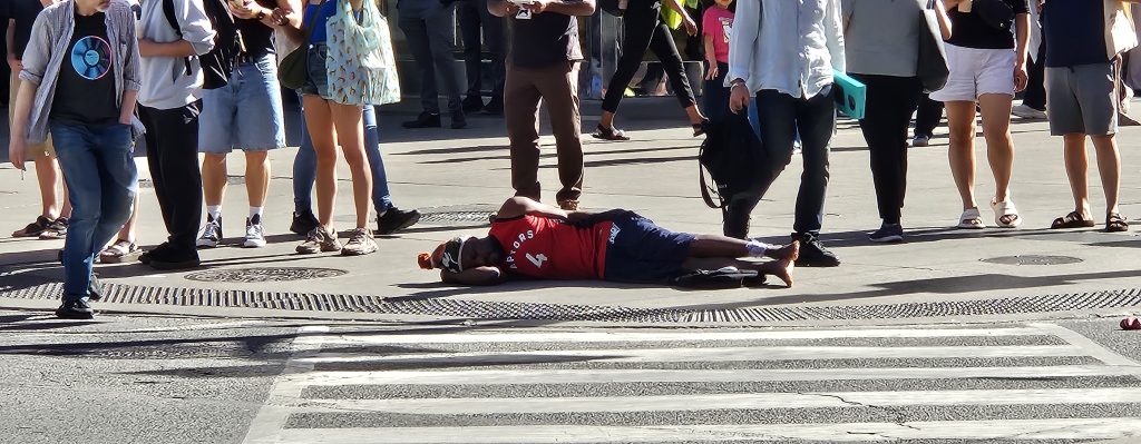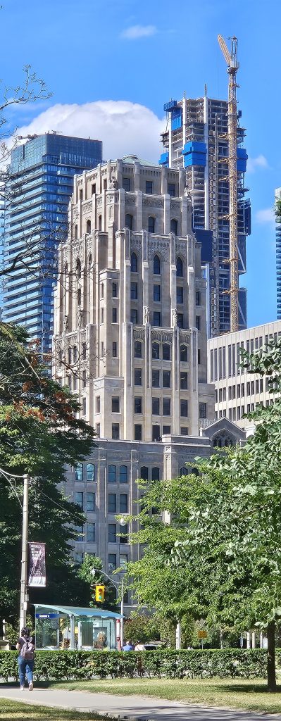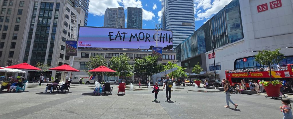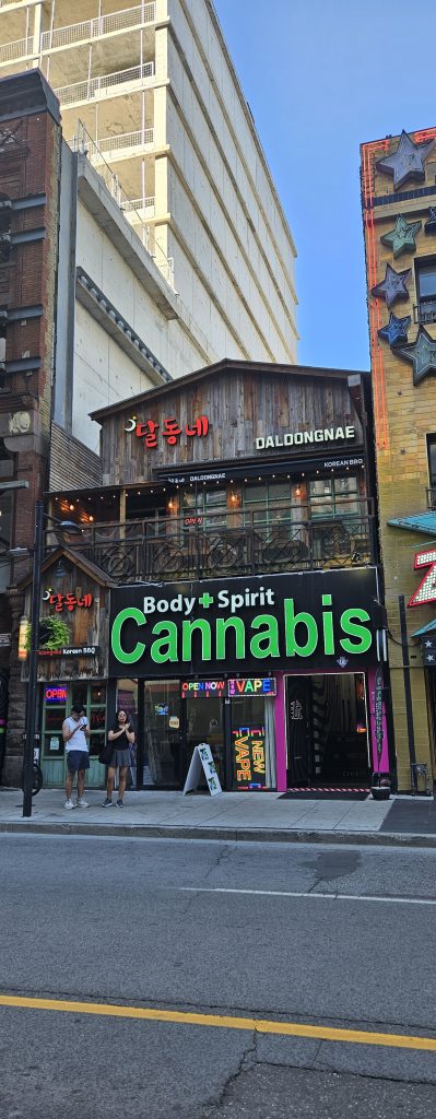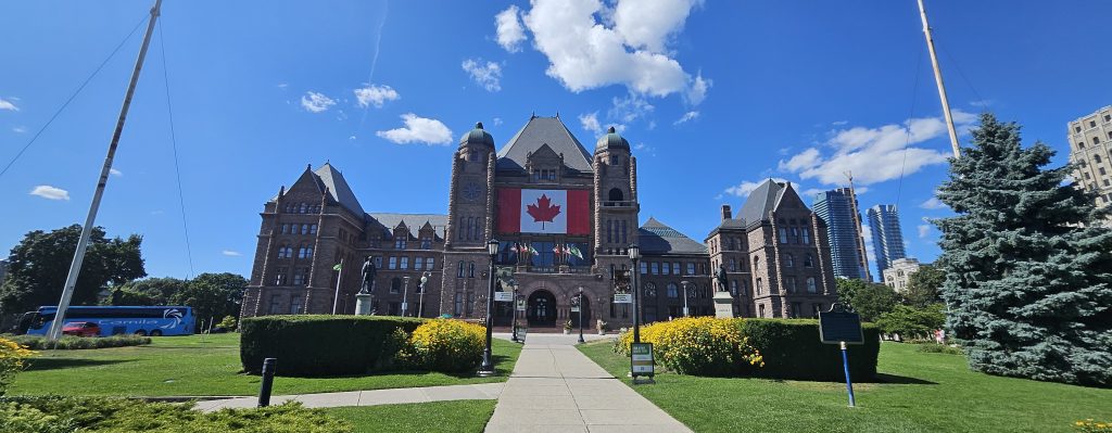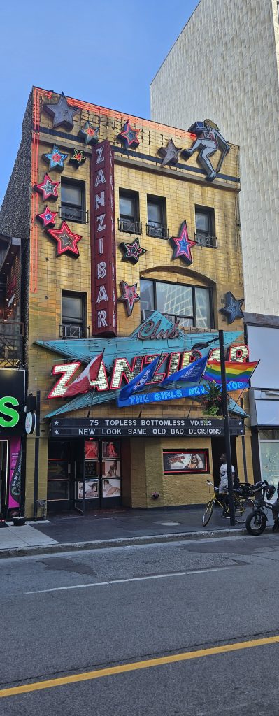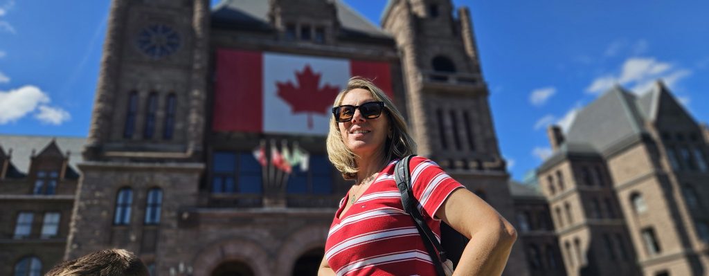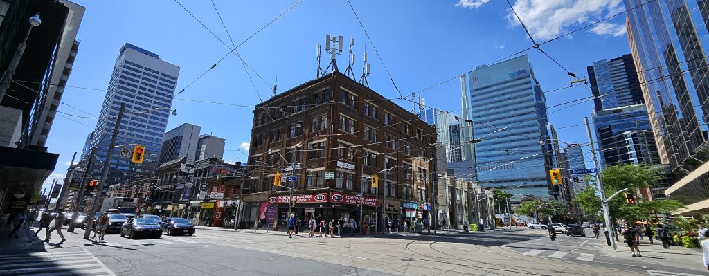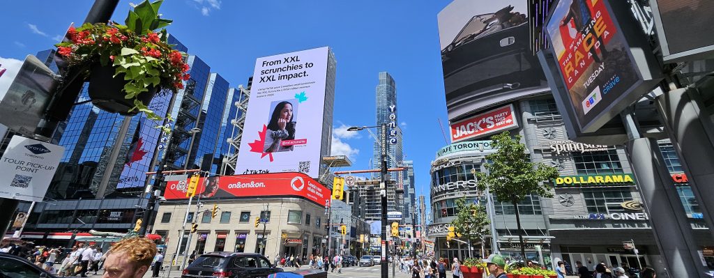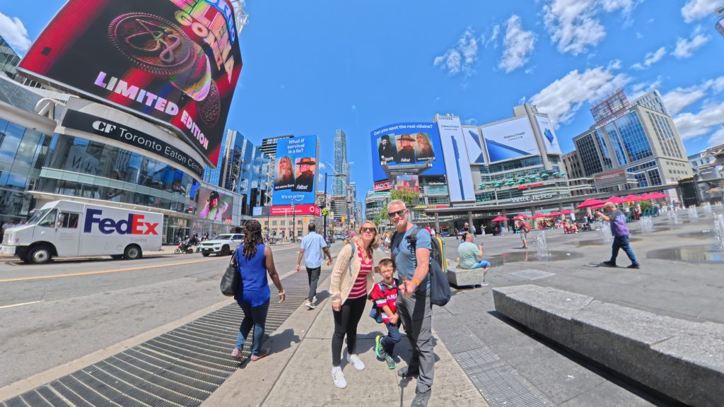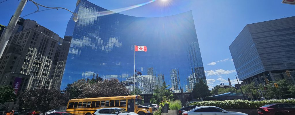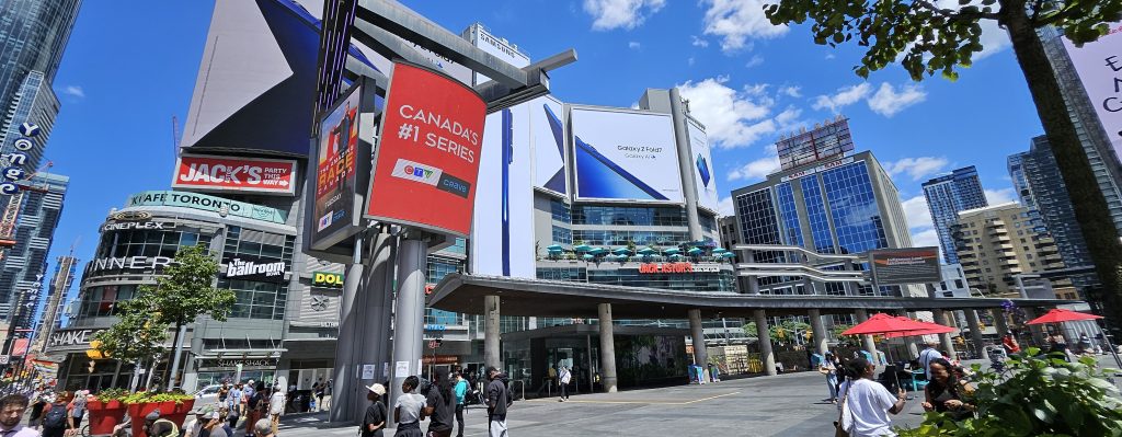 🌇 Le lendemain, 21 juillet, nous sommes partis à la découverte de Toronto, cette ville-monde aux mille visages. Première halte : le Yonge-Dundas Square, surnommé le « Times Square canadien ». Cet immense carrefour piétonnier vibre au rythme des écrans géants, des klaxons et des foules denses. Mais derrière cette modernité clinquante se cachait une autre réalité : nombreux sans-abri, odeurs omniprésentes de marijuana — légalisée depuis 2018 au Canada —, visages marqués par la rue… L’atmosphère y est paradoxale : entre dynamisme économique et misère sociale, le cœur de Toronto bat vite, mais parfois désaccordé.