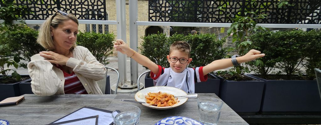 🍝 Pour le déjeuner, nous nous sommes attablés dans un restaurant italien situé dans l’enceinte du centre commercial, non loin des verrières. Le repas, simple et réconfortant, a fait du bien à tout le monde, surtout à Benjamin qui découvrait avec amusement cette ambiance si différente de celle de Jasper ou de Banff.
