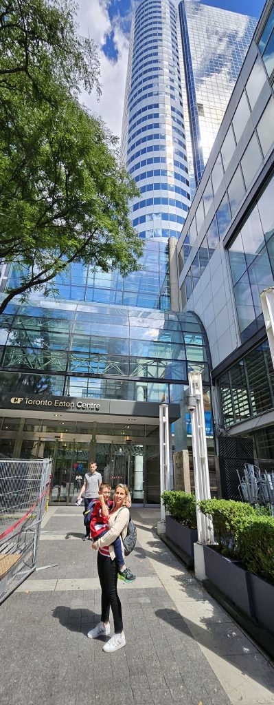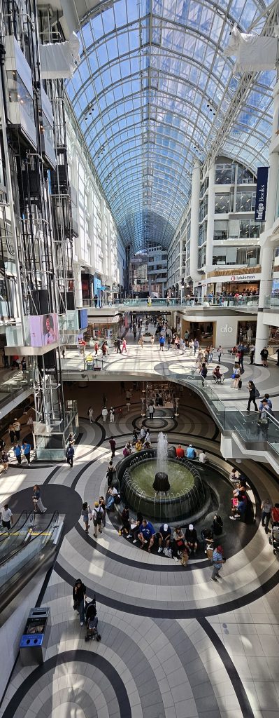 🛍️ Nous avons poursuivi notre balade sur Yonge Street, artère emblématique de la ville, autrefois connue comme la plus longue rue du monde. Les vitrines de magasins s’enchaînaient, jusqu’à ce que nos pas nous mènent à l’entrée de l’Eaton Centre, gigantesque galerie commerciale recouverte d’une verrière impressionnante. Tout en haut, au dernier étage, une serre intérieure avec de grandes plantes luxuriantes crée une parenthèse végétale inattendue au cœur de la ville.